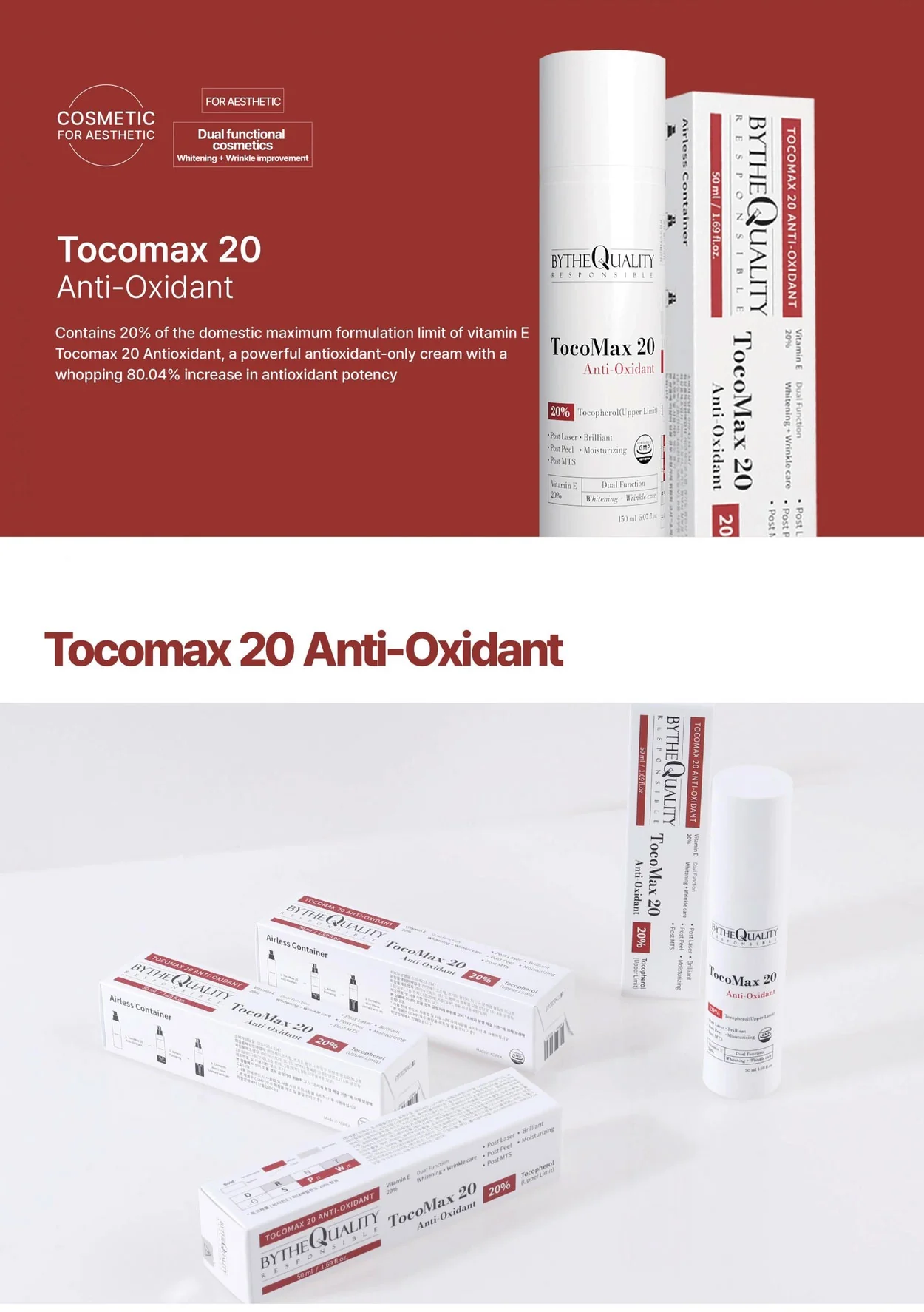 Bạn đang tìm kiếm một loại kem dưỡng đa năng không chỉ chống lão hóa mà còn có khả năng phục hồi da hiệu quả sau các liệu trình chuyên sâu? BYTHE QUALITY TocoMax 20 Anti-Oxidant chính là giải pháp tối ưu. Đây là một loại kem dưỡng đột phá, tập trung sức mạnh của 20% Vitamin E - một trong những hoạt chất chống oxy hóa mạnh mẽ nhất, kết hợp với các thành phần dưỡng da cao cấp khác để mang lại một làn da không chỉ sáng khỏe mà còn được bảo vệ toàn diện.