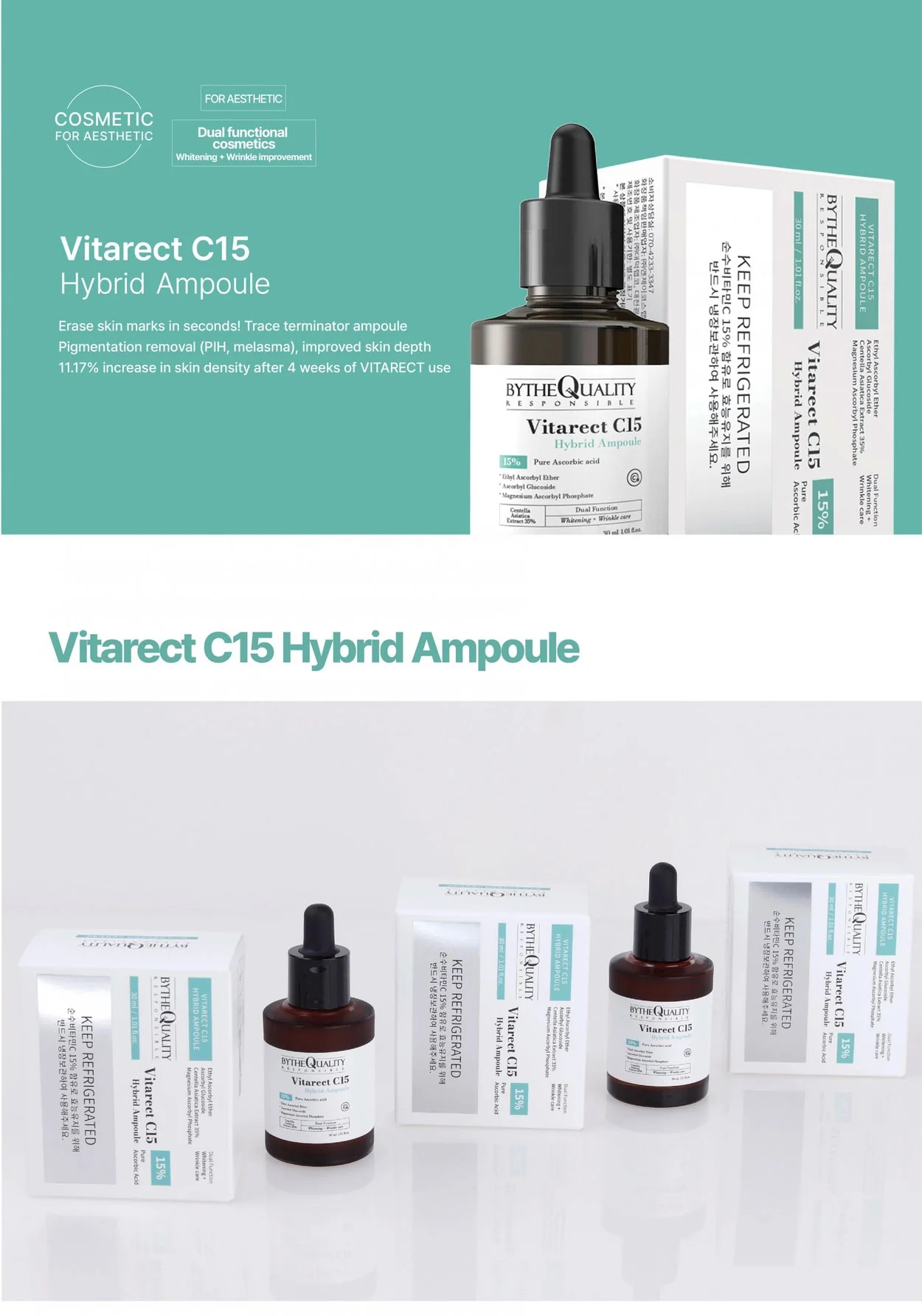 BYTHE QUALITY VITARECT C15 HYBRID AMPOULE sở hữu bảng thành phần ưu việt, được nghiên cứu kỹ lưỡng để mang lại hiệu quả toàn diện: