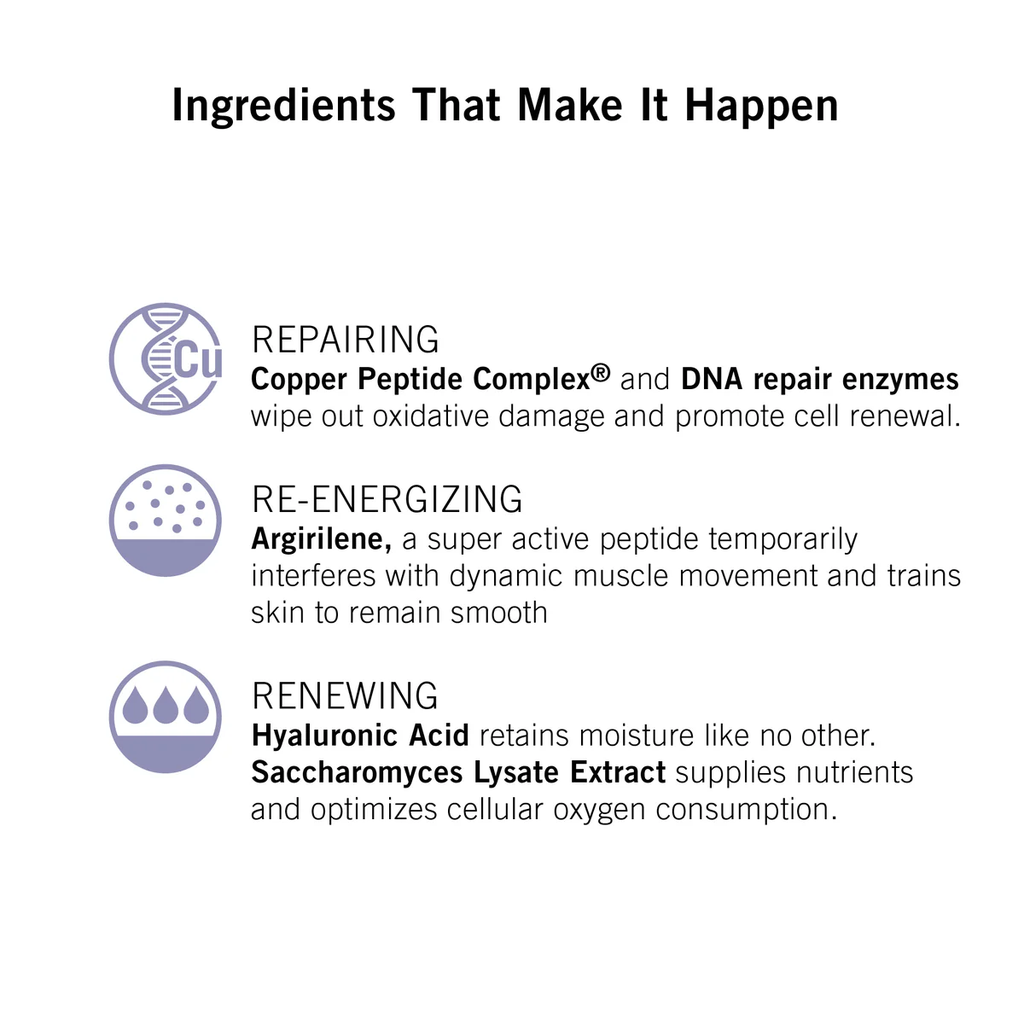Copper Peptide Complex® (Alanine/Histidine/Lysine Polypeptide Copper Hcl): Cần thiết cho quá trình tái tạo mô và ổn định các protein của da, giúp da săn chắc, đàn hồi và làm mờ nếp nhăn.